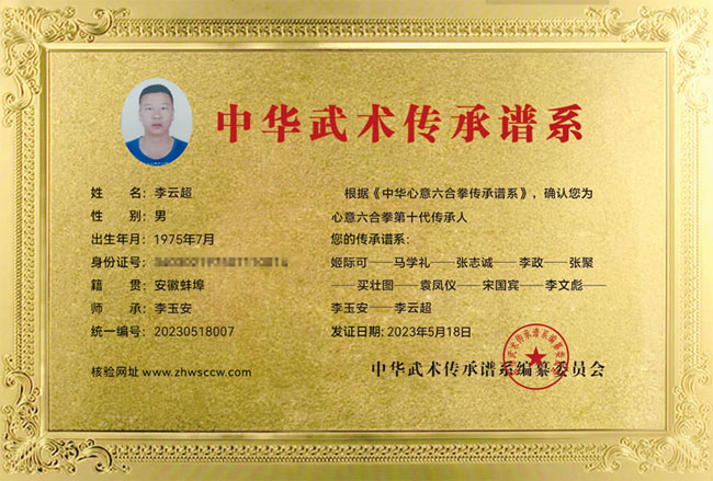 李云超,1975年生,安徽蚌埠人,师承李玉安——心意六合拳第十代传人,武术协会理事成员,荣获优秀教练员荣誉称号。