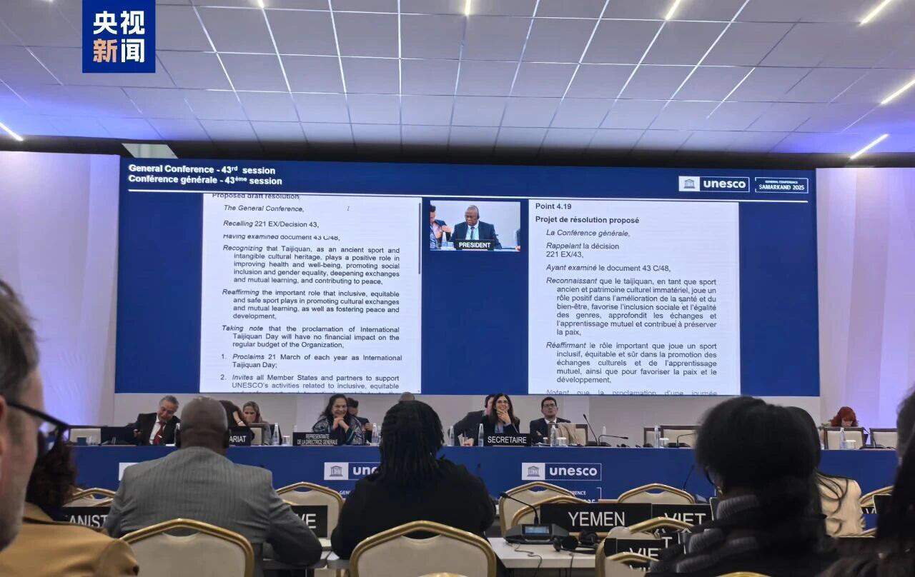 当地时间11月5日,联合国教科文组织大会第 43届会议在乌兹别克斯坦撒马尔罕召开。会议审议通过决议,将每年3月21日(北半球春分日)设立为“国际太极拳日”(International Taijiquan Day)。这是联合国系统首个以武 术项目命名的国际日,标志着太极拳的重要价值获得全球广泛认可,是全球文明倡议的生动实践。